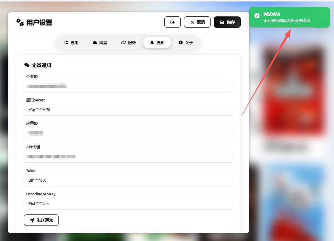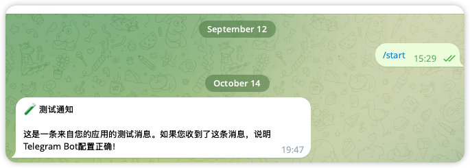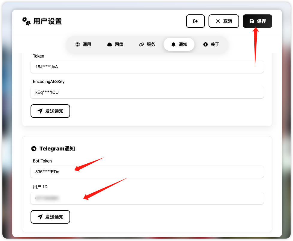 填入刚刚从 @botfather 获取的 API,均输入 @getidsbot 获取的 ID,再点击保存和测试,看看机器人是否给你发送通知,如下图