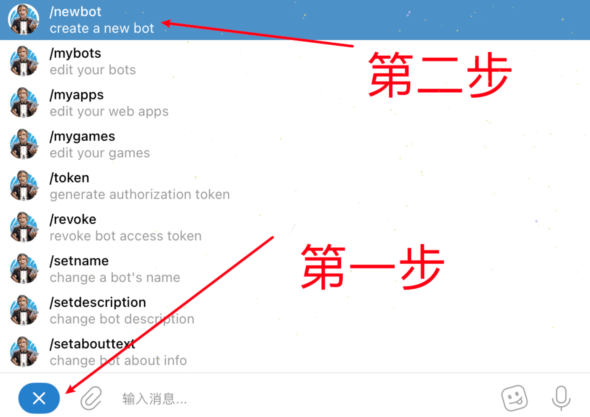 (2). 点击左下角菜单栏,点击最顶部 /newbot
