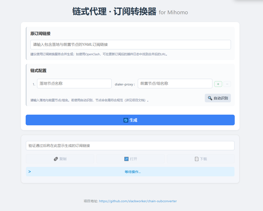 - 生成:点击“生成”按钮,验证并生成增加链式代理配置的新订阅链接,并应用于您的客户端。